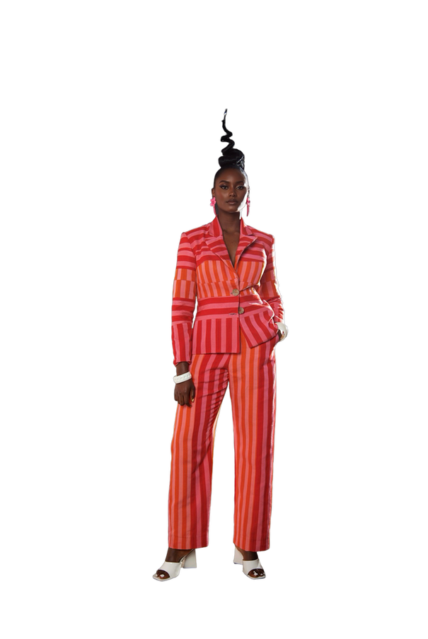 Bright, confident, and effortlessly stylish — the DÚRÓ Power Suit brings a fresh, modern edge to classic tailoring. Designed in bold coral and orange stripes, this look features a structured blazer with a flattering cinched waist and straight-leg trousers that elongate your frame. It’s the perfect mix of power and play ; made for women who want to stand out without saying a word.